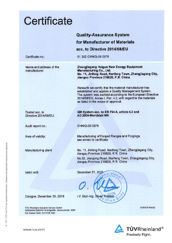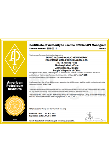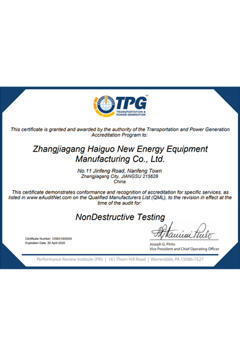 公司取得了美國ABS、法國BV、中國CCS、挪威DNVGL、韓國KR、英國LR、日本NK、意大利RINA等全球八大船級社的工廠認證證書,建立了完善的產(chǎn)品質(zhì)量管理體系。先后獲得了美國API20B資質(zhì)證書、API6A資質(zhì)證書、APIQ1體系證書、TPG的NDT認證證書、TPG 熱處理認證證書、歐盟PED等認證證書,同時也通過了一些國際客戶具有高度專業(yè)要求的資格認證。